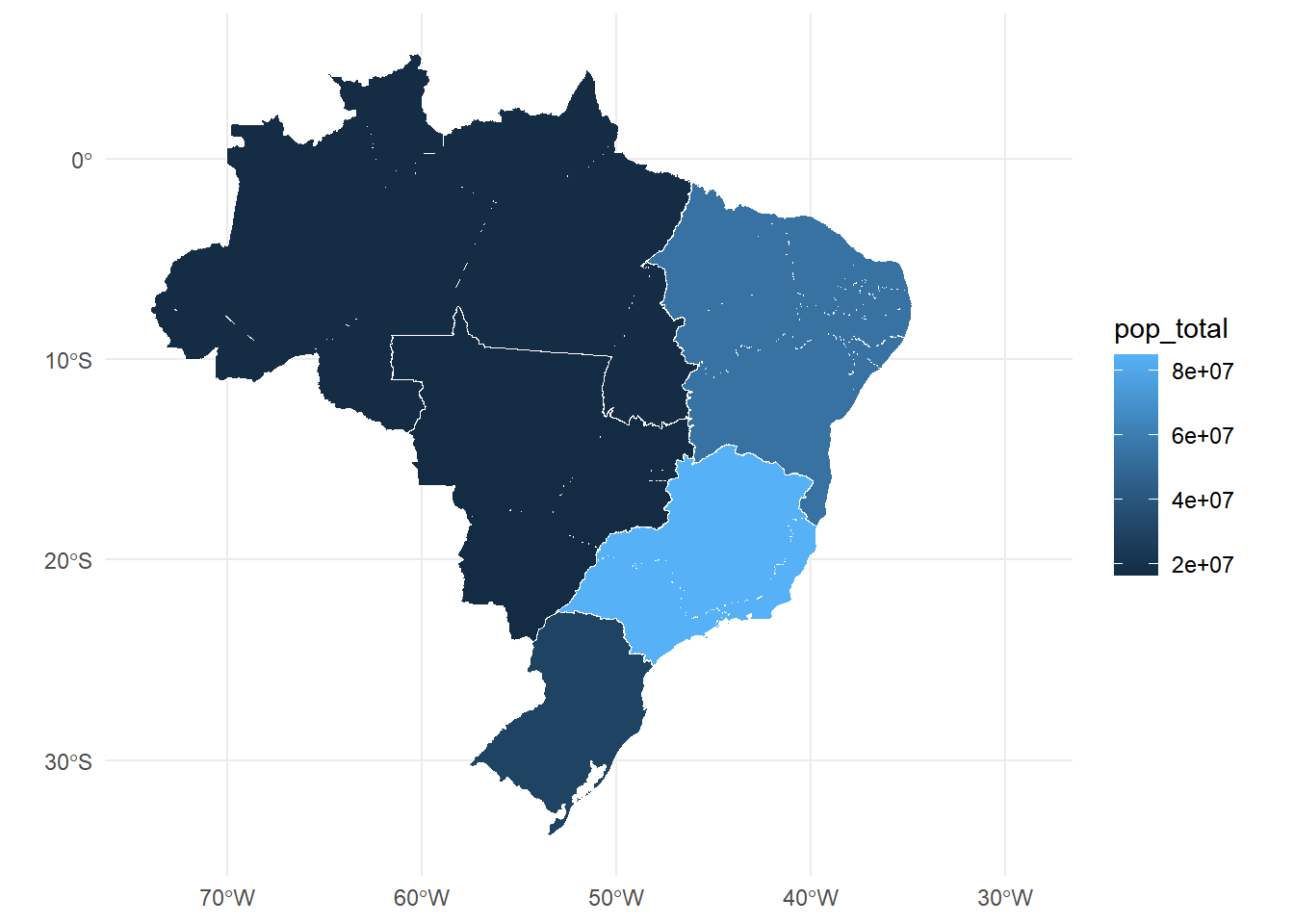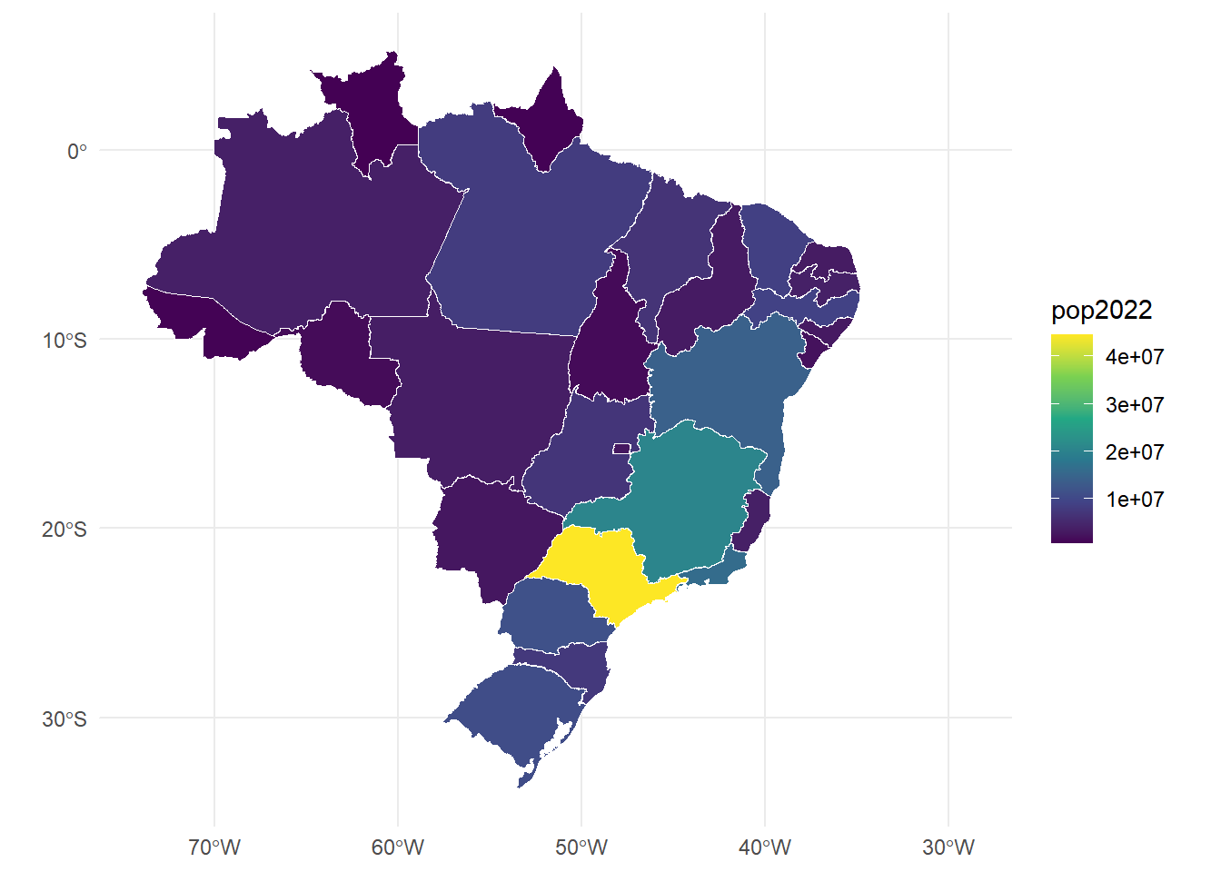 Já vimos anteriormente que é possível agregar duas bases de dados por meio de uma operação de junção (join). O mesmo pode ser feito entre objetos espaciais sf e aqueles em formatos de tabela (data.frame ou tibble, por exemplo). No exemplo abaixo, construiremos um mapa coroplético adicionando dados de população do arquivo pop_uf_br.csv ao objeto uf_br com um left_join(), antes de plotar: