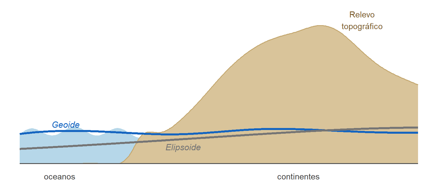 Como o geoide é muito irregular para ser usado diretamente em geoprocessamento, costumamos utilizar outra entidade, o elipsoide. Este, por sua vez, trata-se de uma superfície matemática regular que aproxima a forma da Terra, definida por dois parâmetros (o raio equatorial e o achatamento polar) e que serve de base para os cálculos de coordenadas. A relação entre estes elementos pode ser melhor observada na Figura 5.2.