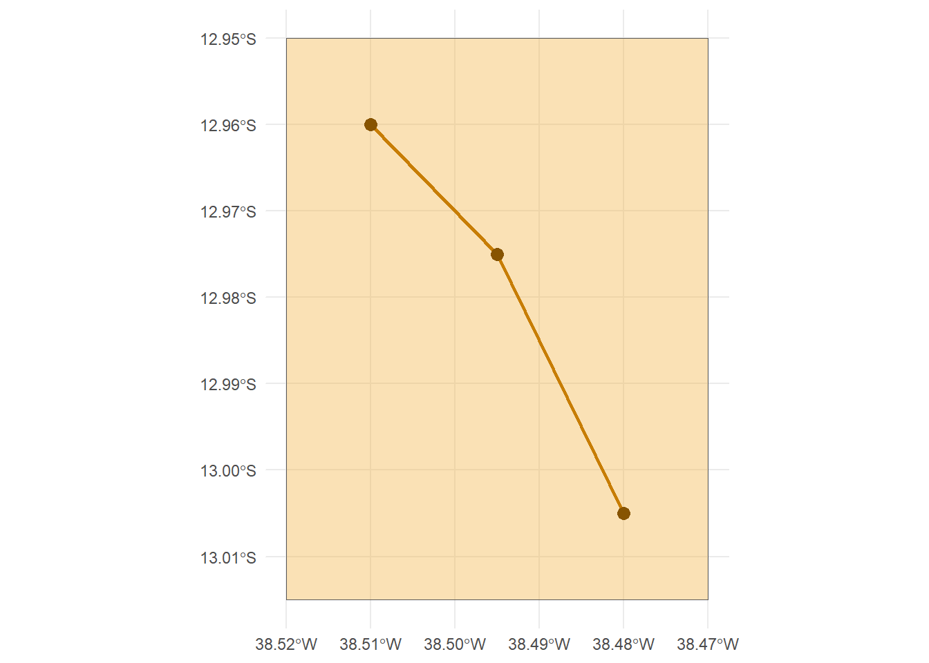st_as_sfc("LINESTRING (-38.51 -12.96, -38.49 -12.97, -38.48 -13.00)")Geometry set for 1 feature