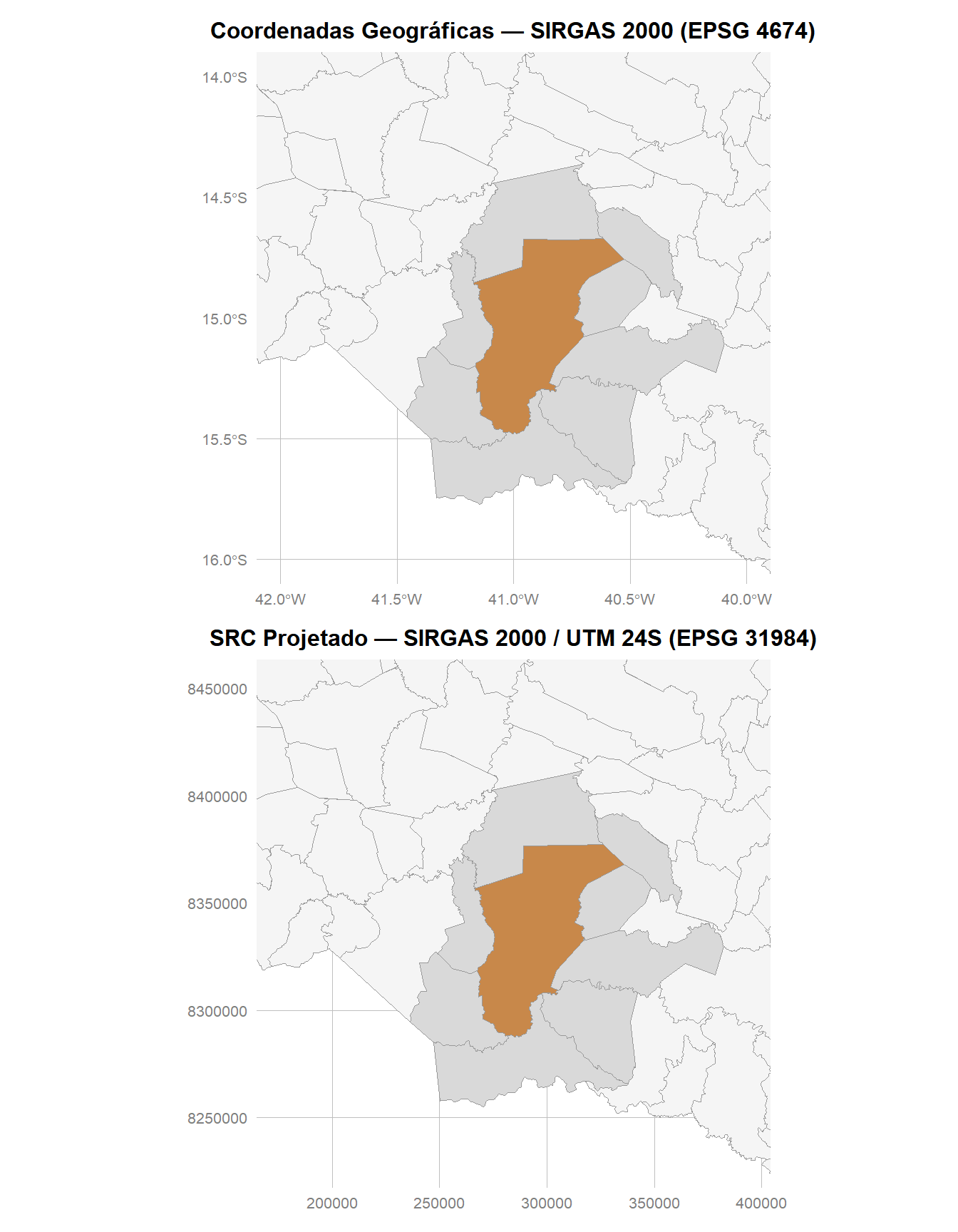 Na prática, para visualização de áreas extensas (ex.: estados inteiros) e intercâmbio de dados, o SRC geográfico (lat/lon em graus) é o mais conveniente. Para análises quantitativas que envolvam medição de distâncias, cálculo de áreas ou criação de zonas de influência, é necessário um SRC projetado com unidades métricas.