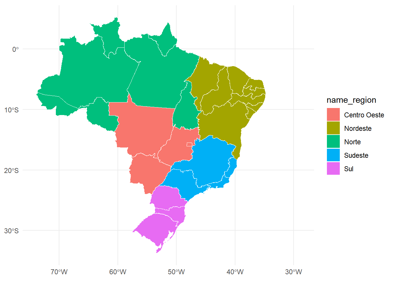 Podemos produzir mapas coropléticos com base em colunas da própria base de dados ou cores determinadas a priori de nosso interesse. A coloração dos polígonos segue o padrão estético do ggplot2 definidos em aes(), com o parâmetro fill representando a cor de preenchimento e color a coloração das bordas. Perceba, no caso abaixo, que fill foi definido dentro de aes(), pois a coloração depende do valor da coluna name_region, ao passo que color foi escolhido arbitrariamente com a cor branca, fora de aes(), sem depender dos valores de qualquer coluna da base de dados.