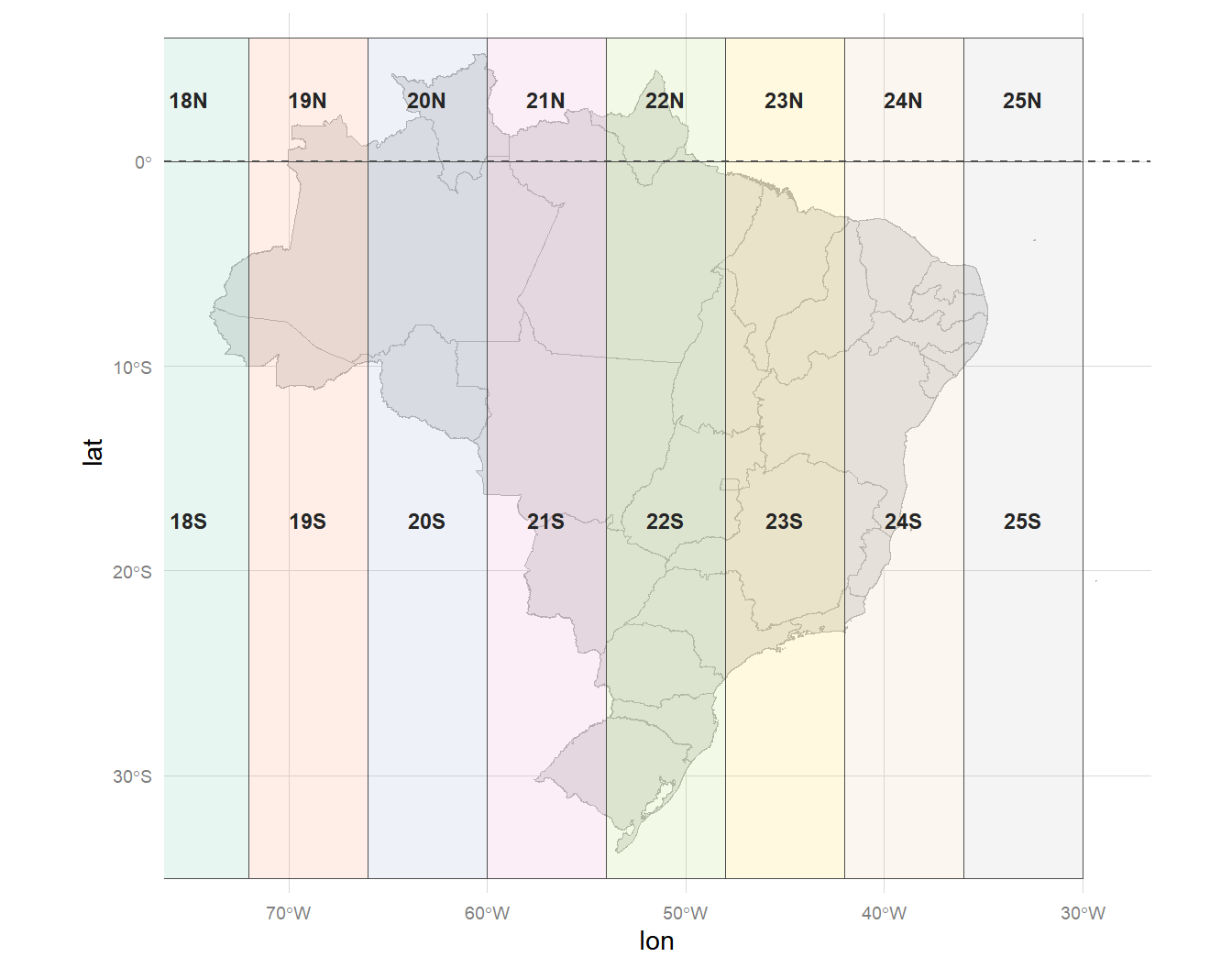O Brasil ocupa principalmente os fusos 18 a 25, e a escolha do fuso correto é essencial para que distâncias e áreas sejam matematicamente precisas. No exemplo da Figura 5.4 anterior, por exemplo, escolhemos o UTM 24S, pois é o fuso UTM onde o município de Vitória da Conquista-BA se localiza.
