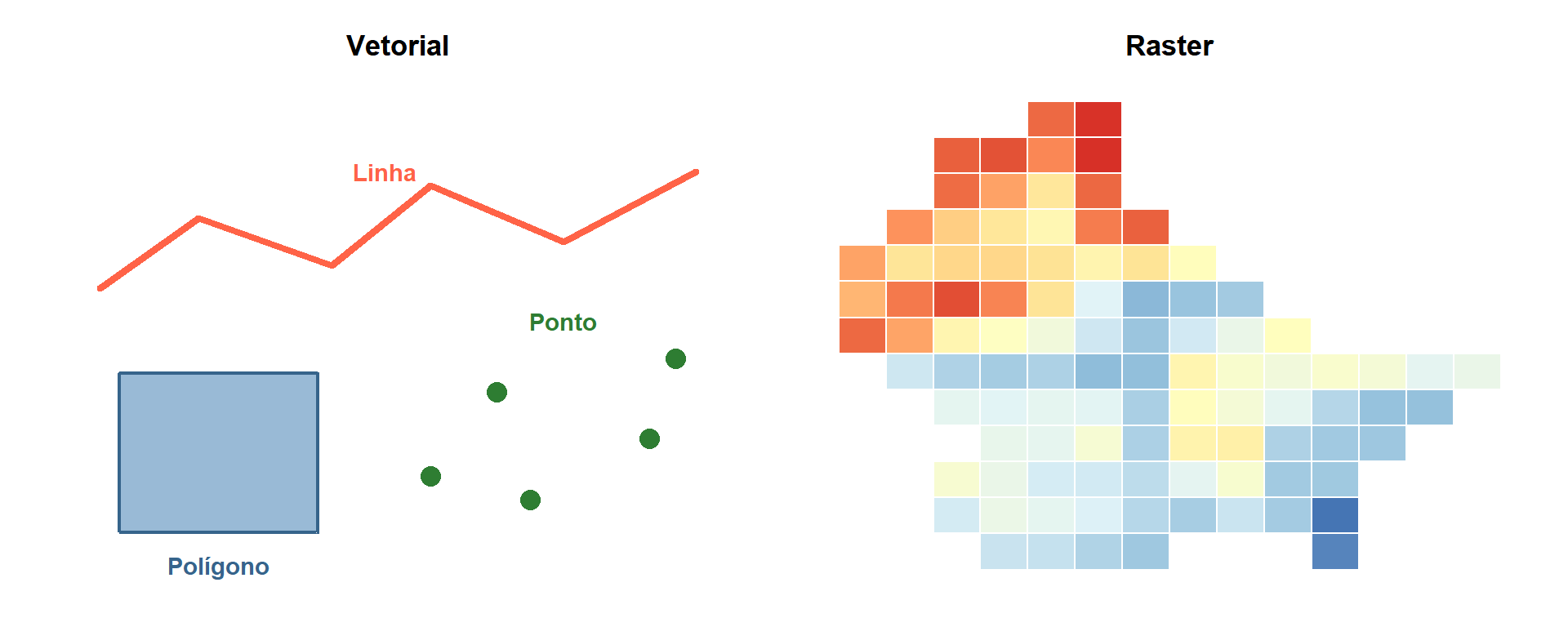 Estes tipos de dados se organizam em dois grandes modelos, conhecidos como vetorial e raster. No modelo vetorial, os fenômenos são representados por entidades discretas com geometria definida. Pontos representam localizações específicas (uma escola, uma estação de metrô, um poço). Linhas representam trajetórias ou redes (uma rua, uma linha de metrô, um rio). Polígonos representam áreas com fronteiras (um bairro, um município, um estado). A cada entidade geométrica, também chamada de feição, se associa uma tabela de atributos, exatamente como em um data frame convencional.