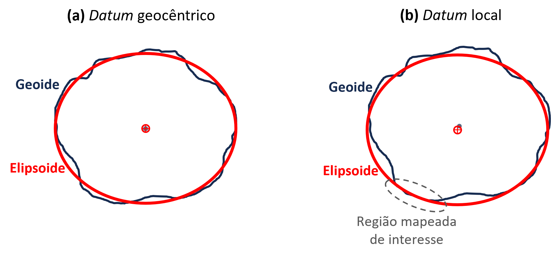 O datum define qual elipsoide utilizar e como ancorá-lo ao planeta, estabelecendo um ponto de referência que relaciona a superfície matemática à superfície física da Terra. Um aspecto importante a ser mencionado é que um datum pode ser geocêntrico ou local, conforme se pode observar na Figura 5.3. Um datum geocêntrico, como o WGS84 (o sistema global usado pelo GPS), posiciona o centro do elipsoide no centro de massa da Terra e é otimizado para uso em escala global. Um datum local, por sua vez, ajusta o elipsoide à superfície em uma região específica, sendo mais preciso naquela área à custa de distorções em outras.