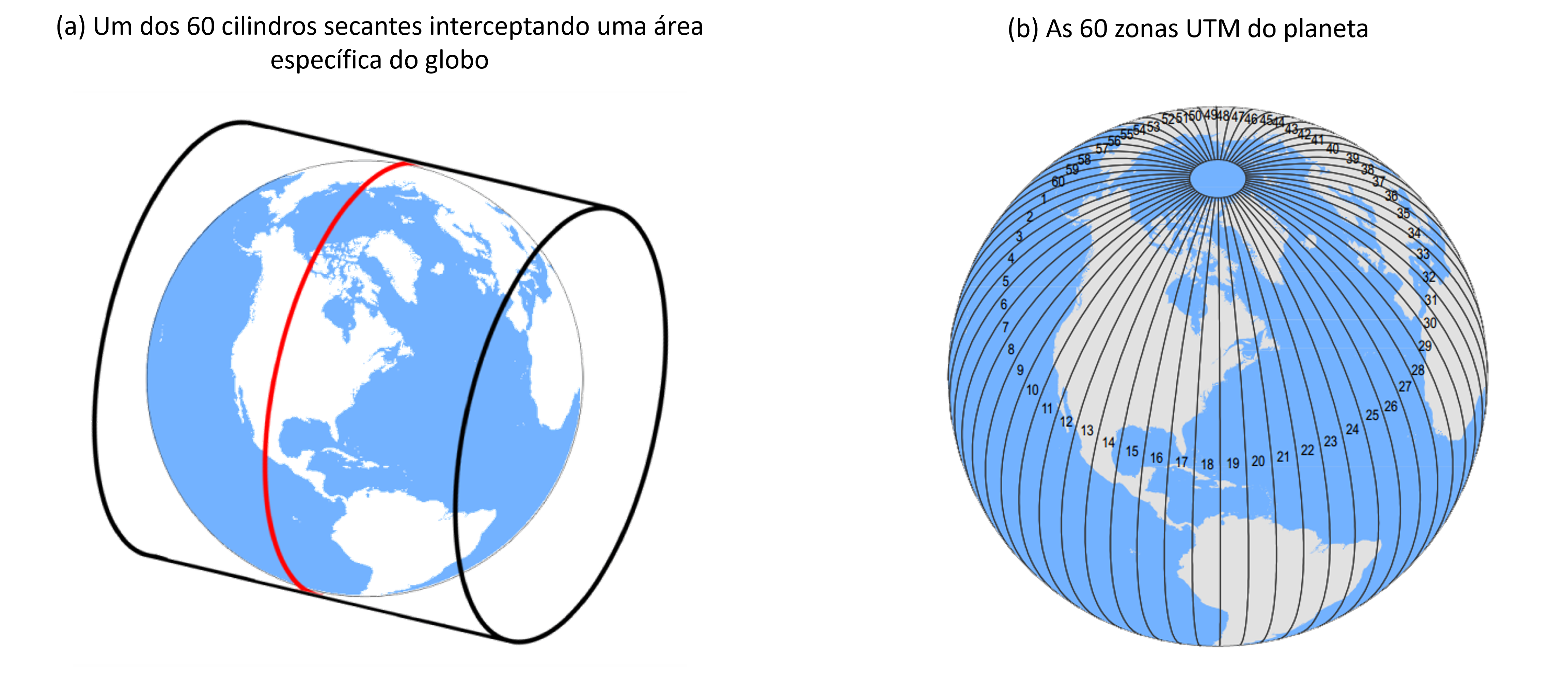 Uma outra projeção bastante notória e que utilizaremos bastante é a UTM (Universal Transverse Mercator), do tipo cilíndrica, mas aplicada de forma transversal e segmentada. Em vez de um único cilindro envolvendo o mundo inteiro, o UTM divide o globo em 60 fusos verticais de 6° de longitude cada, numerados de 1 a 60 (GIS Geography). Para cada fuso, aplica-se um cilindro transversal que minimiza as distorções naquela faixa estreita.