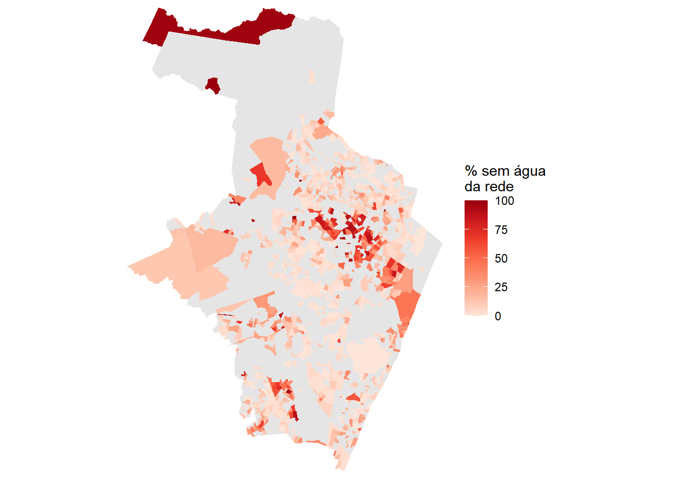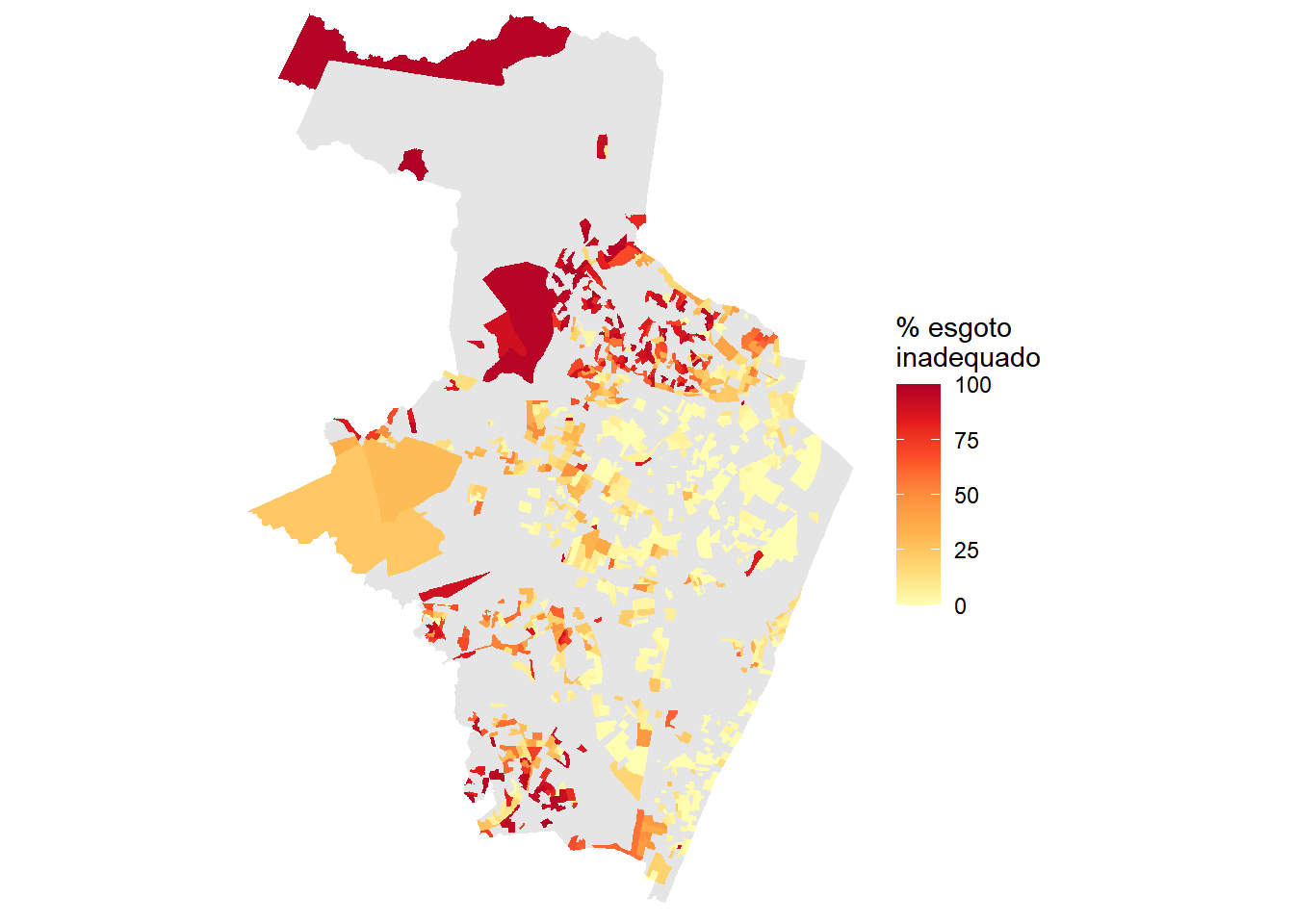 ggplot2para um município de sua escolha. Inclua título, legenda e fonte nos atributos do mapa.Para o município de Salvador, compare os mapas de inadequação de água e de esgoto produzidos neste capítulo. Em quais regiões do município as duas inadequações ocorrem simultaneamente? Como você interpretaria esse padrão em termos de planejamento urbano?