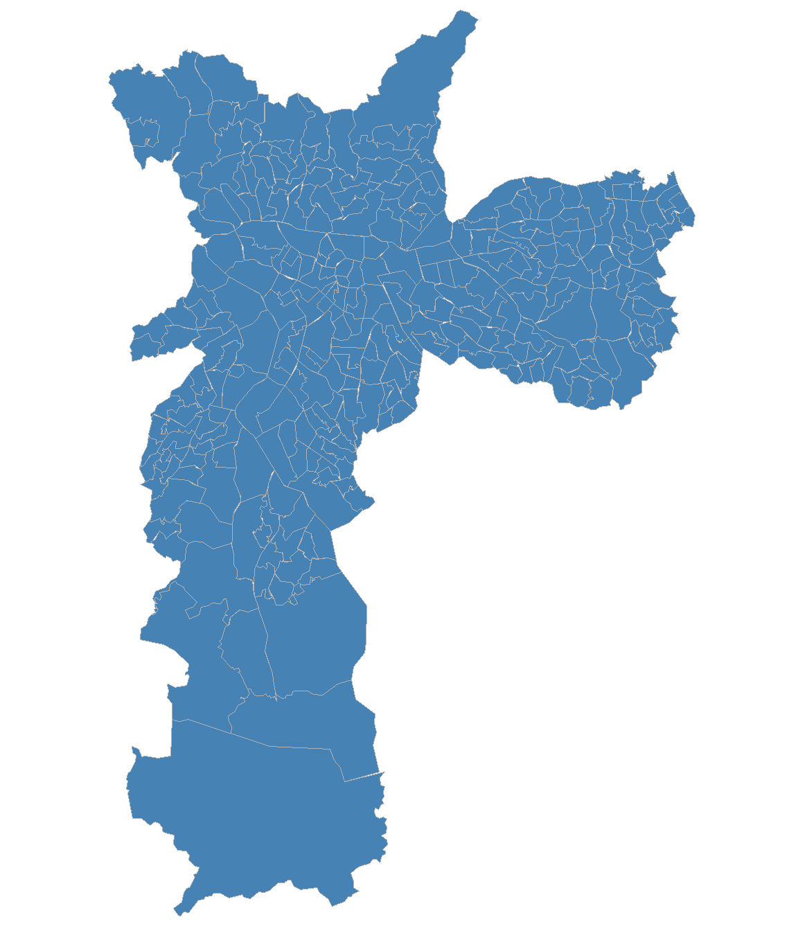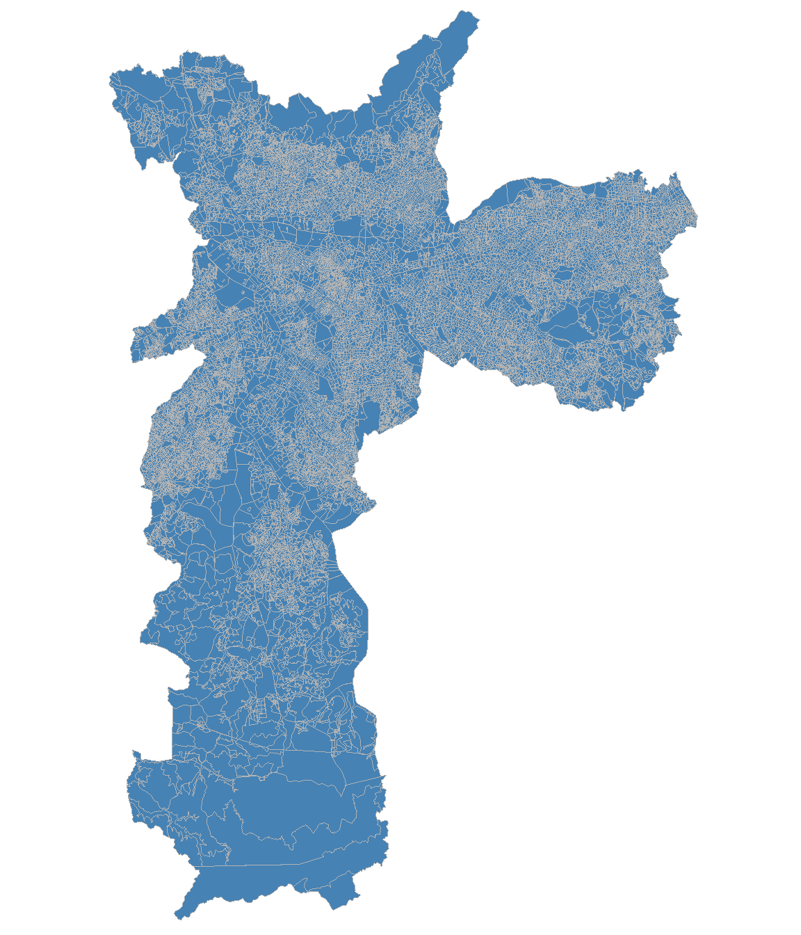 A popularidade desse produto decorre do equilíbrio entre resolução espacial e quantidade de estatísticas disponível por unidade espacial. Enquanto os microdados da amostra permitem análises mais ricas em termos de variáveis (renda, educação, migração), as áreas de ponderação (unidade espacial dos microdados) são muito maiores que os setores censitários. Para se ter uma ideia, no Censo de 2010, o município de São Paulo possuía 5.082 setores censitários, mas apenas 107 áreas de ponderação, conforme ilustra a Figura 7.1. A grade estatística, por sua vez, oferece resolução ainda maior com as quadrículas urbanas de 200 x 200 m, mas contém somente totais de população e domicílio.