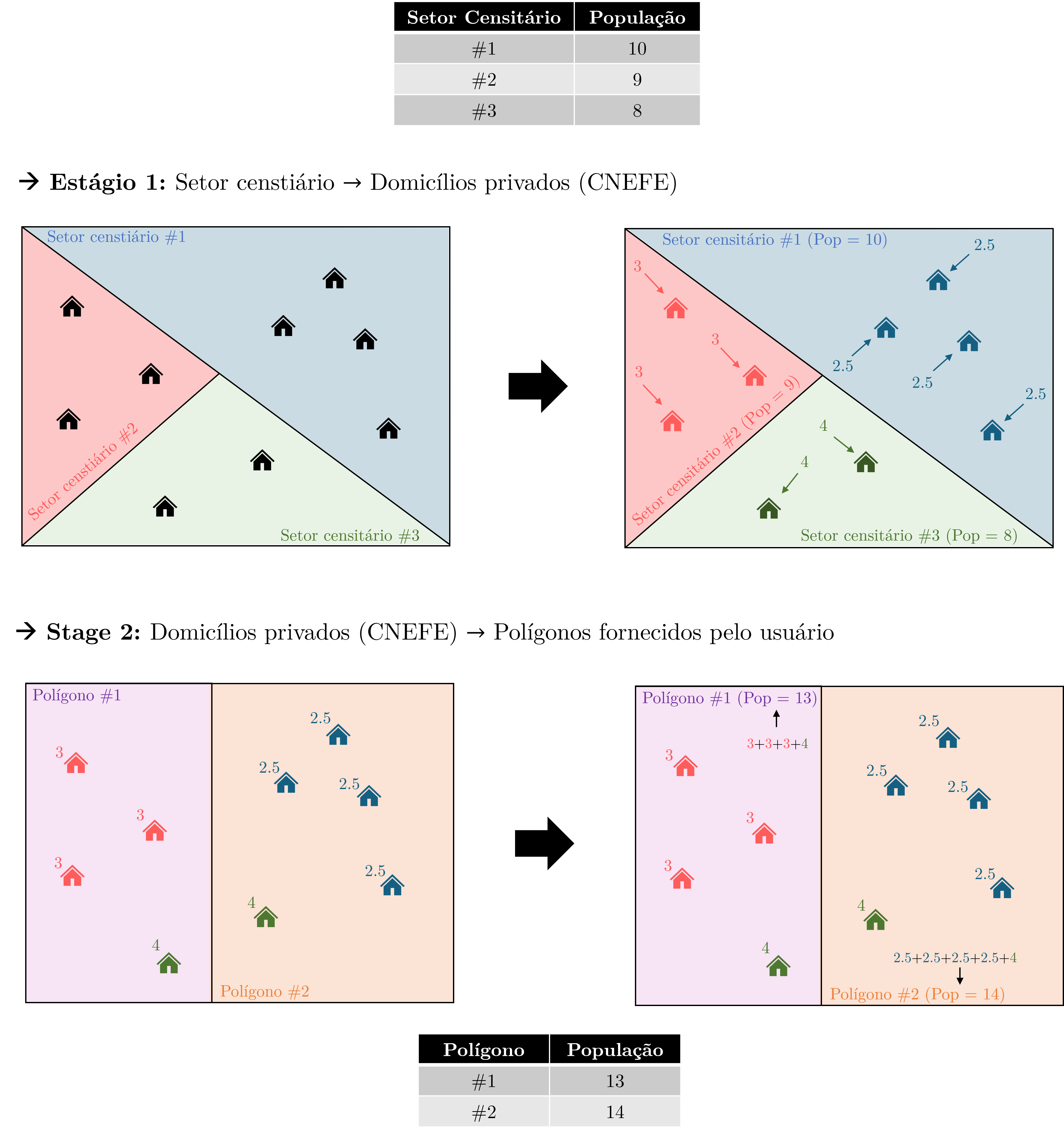 O pacote cnefetools implementa esse fluxo de trabalho de forma integrada, combinando automaticamente os dados do CNEFE com os agregados por setor para produzir estimativas em outras configurações espaciais. Suas duas funções principais são: