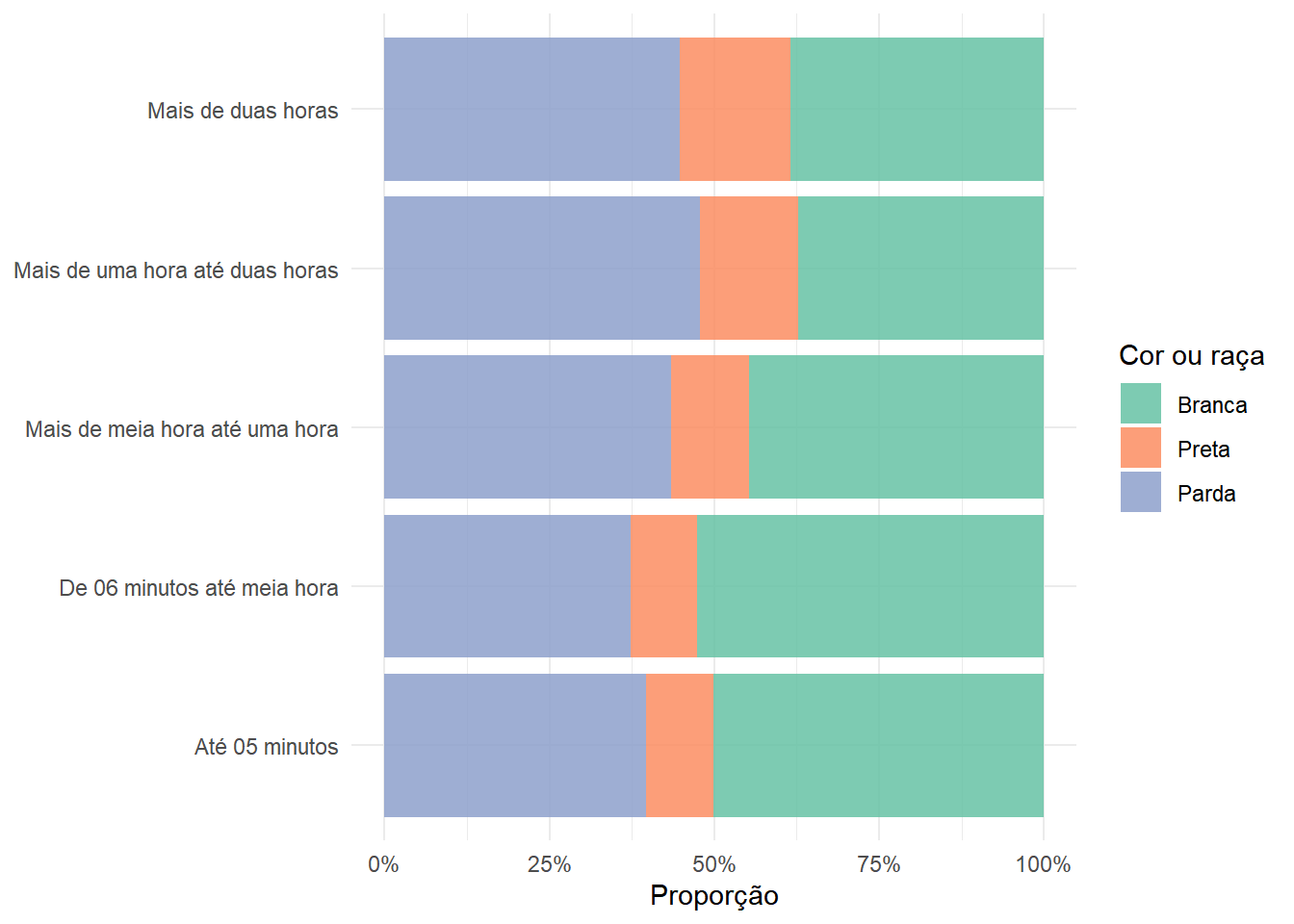 No gráfico acima, note como pessoas negras (pretas ou pardas) tendem a compor uma maior proporção dos indivíduos nos tempos de viagens maiores (acima de meia hora). Lembre-se, entretanto, de que os valores de proporção plotados são estimativas pontuais e que a variabilidade deve ser devidamente considerada na hora de realizar inferências a respeito dessa relação.