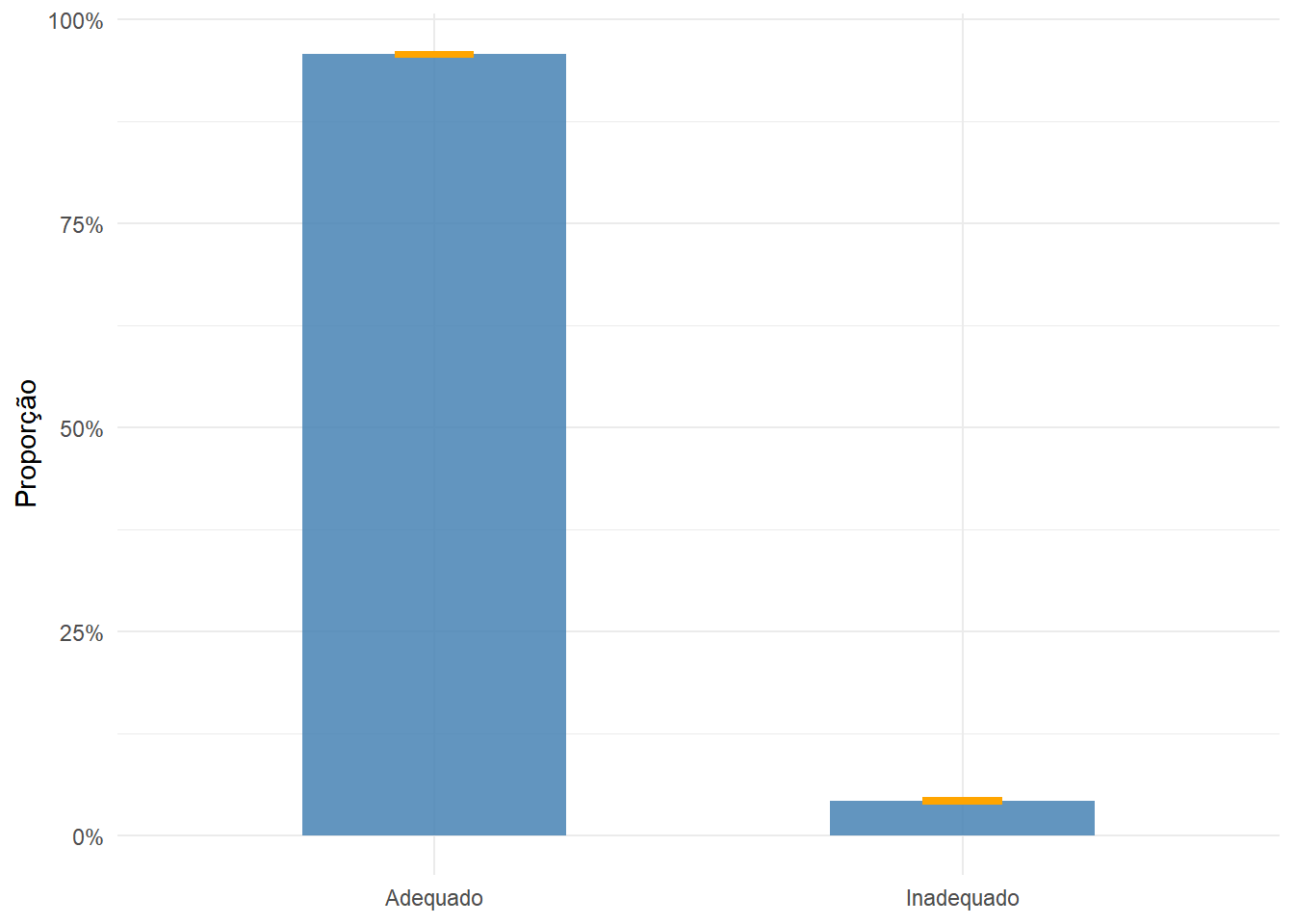 O padrão espacial é marcante, com áreas com rendimentos mais altos concentrando-se na região sudeste do município, enquanto os menores rendimentos predominam em regiões mais periféricas ao Sul e ao Norte. O mapa da Figura 8.10 apresenta, para as mesmas unidades espaciais, a proporção de domicílios atendidos por esgotamento sanitário adequado. O procedimento é idêntico ao do mapa anterior, substituindo survey_median() por survey_prop() e criando uma variável indicadora antes do agrupamento.