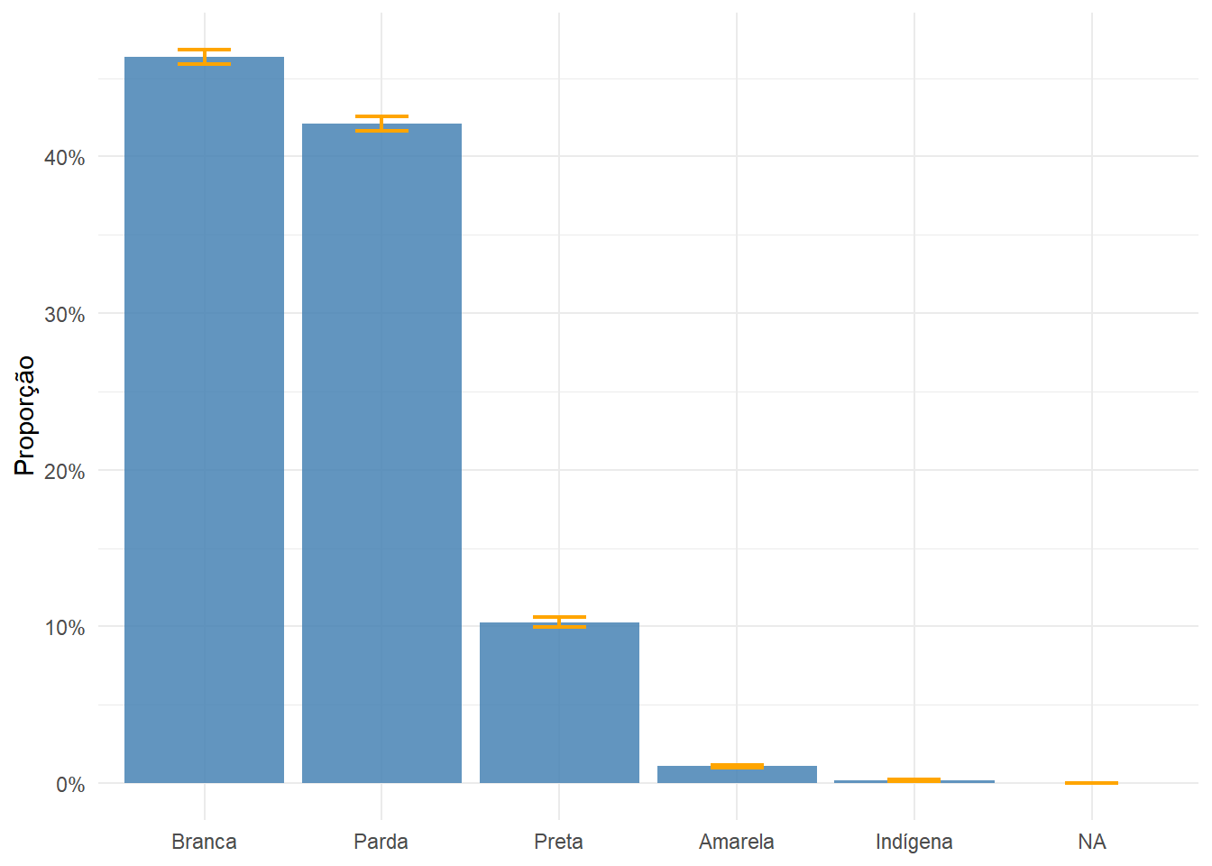 Com o plano amostral de indivíduos configurado, podemos explorar variáveis sobre as pessoas que o Questionário Básico não cobre. Começamos com a distribuição por cor ou raça (V0606). O gráfico a seguir apresenta a proporção estimada para cada grupo, com intervalo de confiança de 95%.