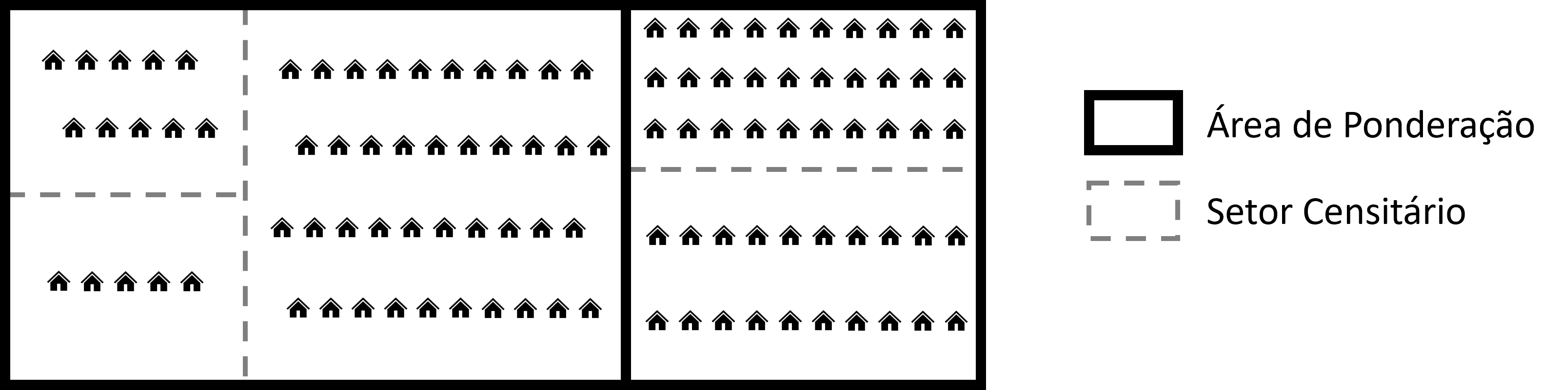 Numa pesquisa por amostragem probabilística, cada domicílio selecionado não representa apenas a si mesmo. Ele “fala” por outros domicílios que não foram sorteados. Para quantificar essa representatividade, cada domicílio da amostra recebe um peso amostral, que indica quantos domicílios ele representa na população. Para esclarecer esse processo, suponha um município hipotético com a configuração da Figura 8.1, com os 105 domicílios distribuídos em 3 áreas de ponderação e 5 setores censitários.