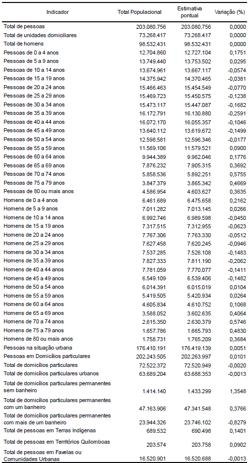 Na tabela da Figura 8.3 abaixo, obtida de um screenshot do documento metodológico do Censo de 2022 (IBGE, 2024), é possível evidenciar o resultado desse processo, comparando as diferenças entre os totais observados e os totais estimados com os pesos amostrais calibrados. Observe que as diferenças são sempre menores que 1%, à exceção da variável Total de domicílios particulares permanentes sem banheiro (~1,35%).