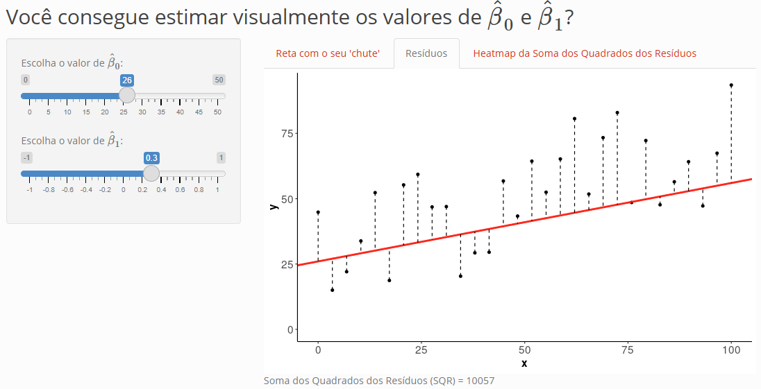 betasMMQvisual is an interactive educational Shiny app designed to build visual intuition for the Ordinary Least Squares (OLS) method in simple linear regression. The user manually adjusts two sliders — the intercept (β₀) and the slope (β₁) — and observes in real time how their chosen line relates to the data across three views: a scatter plot with the fitted line, a residuals plot showing the squared vertical distances being minimized, and a heatmap of the Sum of Squared Residuals (SSR) over the full (β₀, β₁) parameter space with the current position marked. The heatmap reveals the bowl-shaped convex surface of the OLS objective function and its unique minimum, inviting users to discover the OLS estimates through guided trial and error rather than being handed the formula directly.