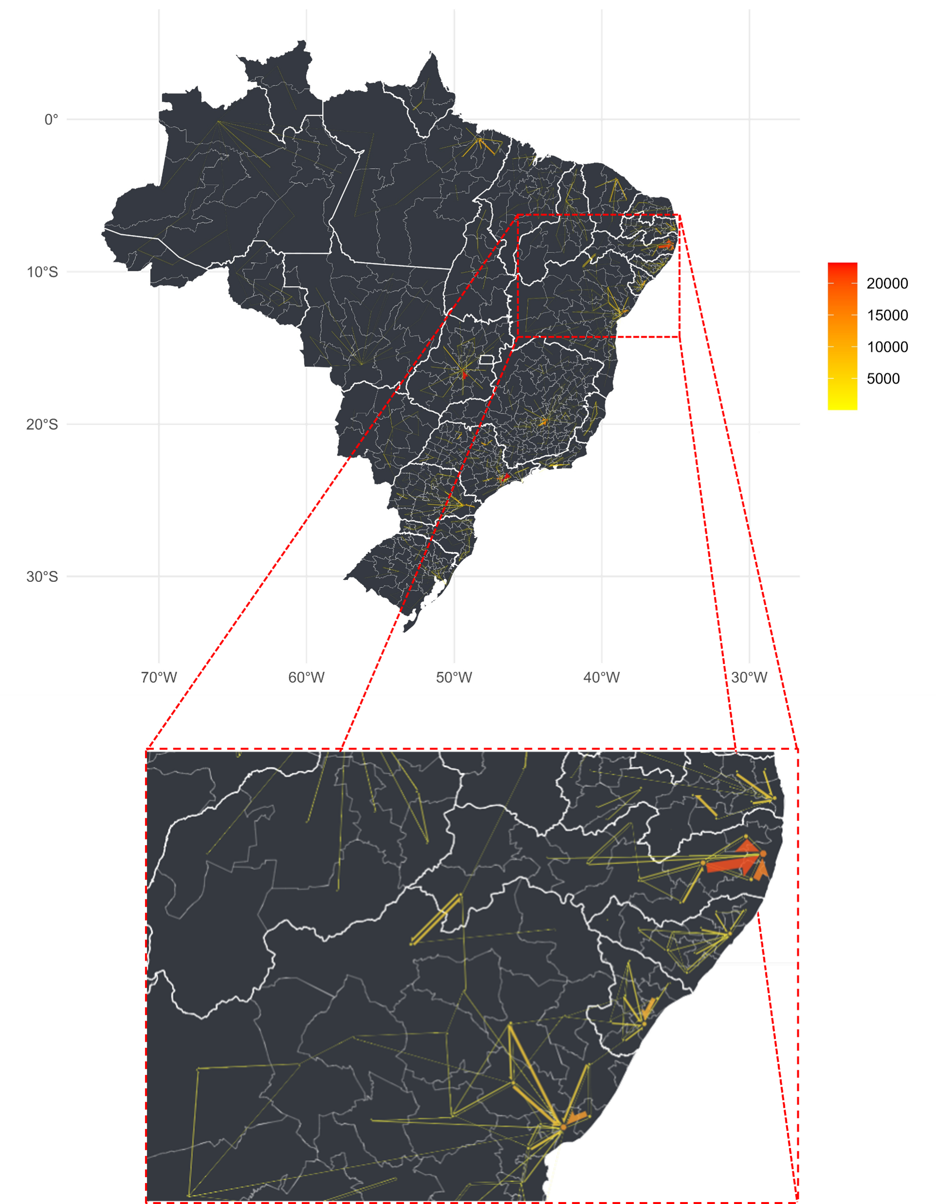This dataset compiles inpatient hospital authorization records from Brazil’s Sistema Único de Saúde (SUS), organized as origin-destination flow tables capturing intercity patient movements across the country’s public healthcare network. Covering 2008 to 2024 (17 years) and all Brazilian municipalities, it contains nearly 200 million unique hospitalization records stored in columnar Parquet format (one file per year) alongside aggregated OD flow tables stratified by procedure complexity (medium vs. high) and category (diagnostic, clinical, surgical, and transplants). Supporting files include the R scripts used for data retrieval and processing, municipal health region mapping tables, and geospatial polygon files. The dataset’s scale and longitudinal depth make it particularly suited for research on healthcare access, regional health planning, and geographic disparities in the Brazilian public health system.
