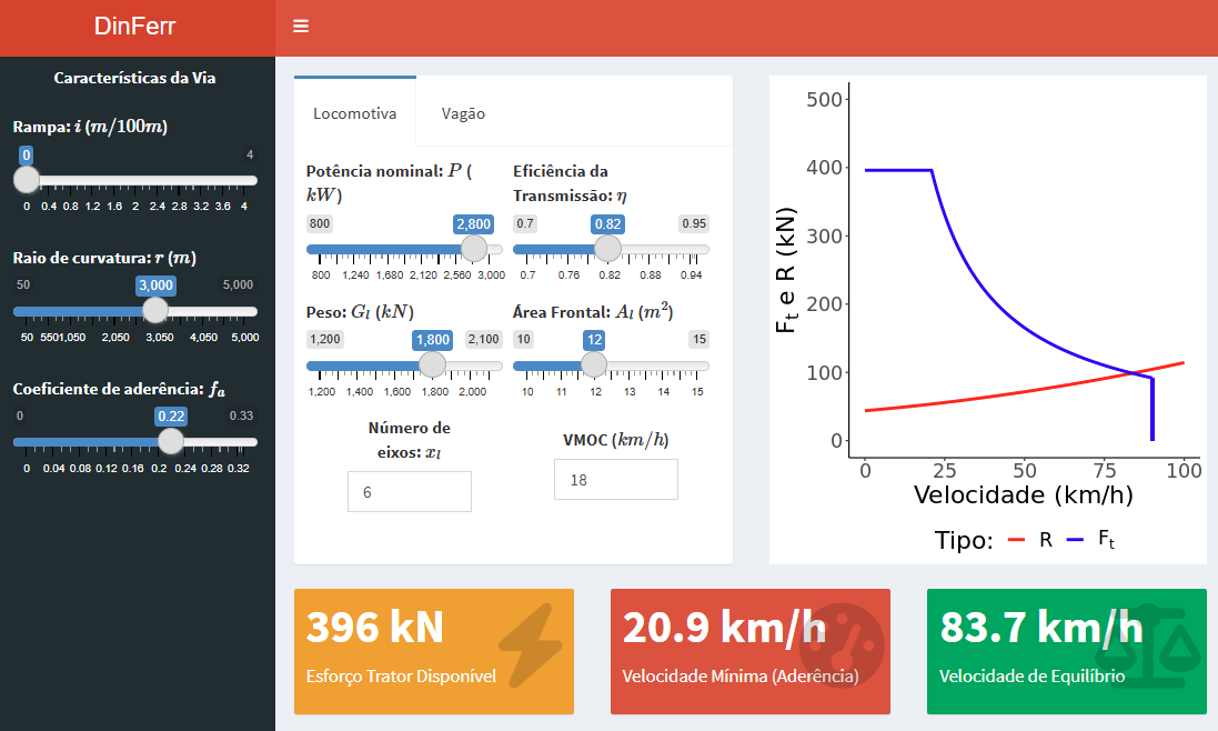 DinFerr is an interactive educational dashboard built with R Shiny, developed as a companion tool for the Railways Engineering course (ENG133) at UFBA. The app simulates train dynamics by computing the equilibrium velocity, the speed at which locomotive tractive force equals total movement resistance, from user-supplied infrastructure and rolling stock parameters. Track inputs cover slope, curve radius, and adhesion coefficient, whereas locomotive inputs cover power, transmission efficiency, weight, frontal area, and axle count and wagon inputs cover fleet size, gross weight, axles, and frontal area. All calculations are fully reactive, updating in real time as parameters change. The main output is a tractive effort vs. resistance chart (plotted against speed) showing the adhesion-limited plateau, the power-limited hyperbolic decay, and their intersection with the resistance curve. Three output metrics are displayed: available tractive effort, minimum velocity, and equilibrium velocity.