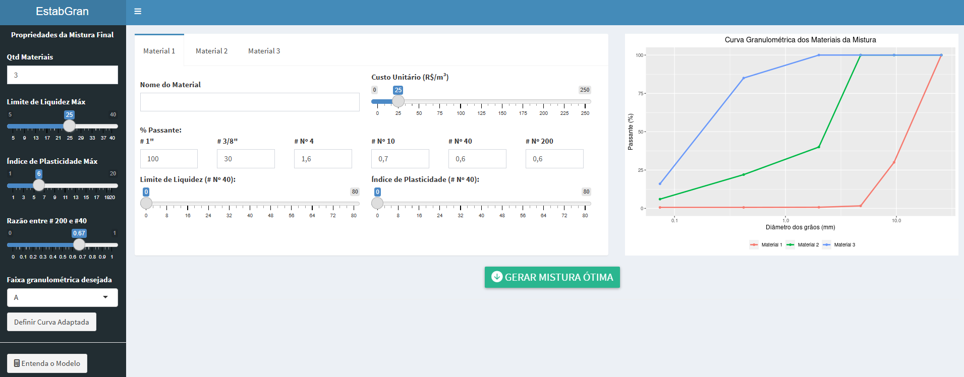 EstabGran is an R Shiny web application for optimizing material dosing in granulometric stabilization of pavement base layers. Given a set of candidate materials (soils and aggregates), the app determines the blend proportions that satisfy Brazilian particle-size distribution requirements at minimum total cost, using a Linear Programming model solved via the lpSolve package. Users specify up to five materials — each with unit cost, gradation curve (six sieves), liquid limit, and plasticity index — and select a target specification band (curves A–F from the DNIT IPR-719 Pavement Manual) or define custom gradation limits. When a feasible solution exists, the app returns the optimal proportions, the resulting mixture cost in R$/m³, and a particle-size distribution chart of the blend overlaid on the specification envelope to confirm compliance. The app was presented at the 37th ANPET Congress (Santos, 2023).