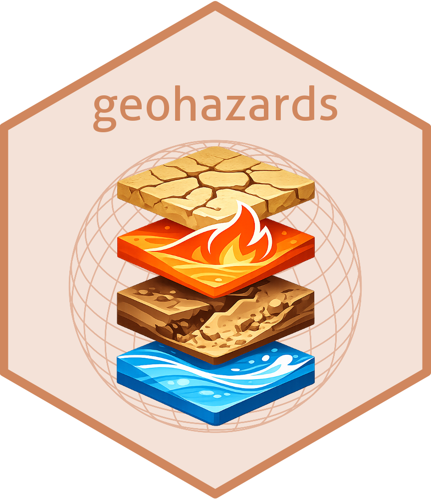 {geohazards} is an R package for extracting global data related to climate risk, susceptibility, and vulnerability. It provides a simple interface for accessing remote geospatial datasets (such as flood susceptibility indices, landslide risk maps, and geological hazard layers) directly from R, without manual downloading. The package currently provides get_hand(), which retrieves the GLO-30 HAND (Height Above the Nearest Drainage) raster at 30 m resolution for any polygon supplied by the user. It is actively being expanded with new data sources and functions, and is planned for submission to CRAN.