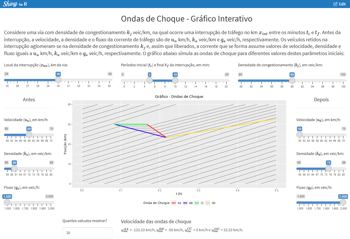 OndasChoqueTrafego is an interactive educational Shiny app for visualizing traffic shock waves arising from a temporary road interruption, based on the Lighthill-Whitham-Richards (LWR) macroscopic model. The user defines the location and duration of the interruption, the jam density, and the flow, density, and speed of the traffic stream before and after the event. From these inputs, the app analytically computes up to four shock wave speeds — the backward queue-forming wave (BB), the forward discharge wave (AA), the stationary wave at the interruption point (CC), and, when the queue grows faster than it dissipates, a platoon-dissolution wave (DD). The main output is a time-space diagram showing individual vehicle trajectories alongside the color-coded shock wave boundaries, with the computed wave speeds displayed in mathematical notation below the chart.