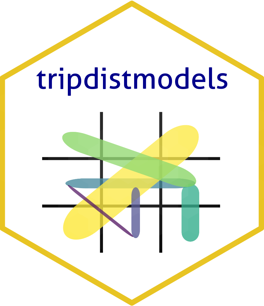 {tripdistmodels} is an R package for trip distribution modeling in transportation planning, which implements two classic workhorses of the four-step travel demand model’s distribution step. With furness(), you can use Iterative Proportional Fitting (IPF) to rebalance a seed OD matrix to given production and attraction totals, whereas gravit() synthesizes OD flows from scratch with a doubly constrained gravity model and calibrated deterrence functions. Three deterrence forms are supported (exponential, power, and combined), alongside three parameter estimation strategies: Poisson log-likelihood maximization (via L-BFGS-B), the Hyman heuristic for exponential deterrence, and fixed user-supplied values. Both functions accept OD and cost data as square matrices or long tables, making the package flexible for different data workflows common in transportation planning practice.