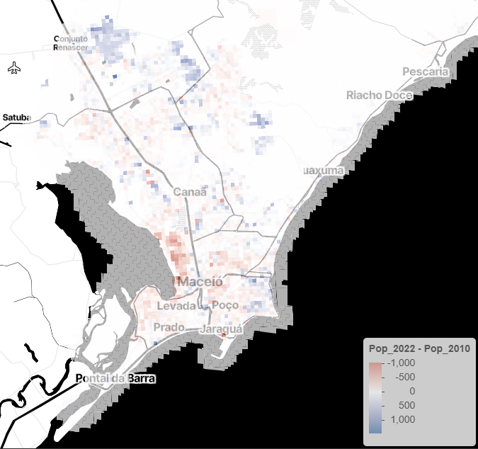 This self-contained R script automates the full pipeline from raw data download to an interactive choropleth map of intra-urban demographic change in Maceió between the 2010 and 2022 Brazilian censuses. It downloads both IBGE statistical grids (200×200 m cells) directly from the IBGE FTP server, clips them to the municipal boundary retrieved via {geobr}, joins the two grids on the common cell identifier, and computes absolute changes in population and occupied dwellings per cell. The output is a Leaflet map using a diverging red–white–blue palette centered on zero, allowing users to identify at fine spatial resolution which parts of the city grew and which declined over the intercensal period.